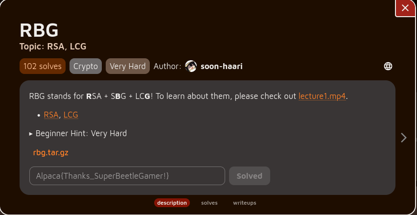 - Description: RBG stands for RSA + SBG + LCG! To learn about them, please check out lecture1.mp4.